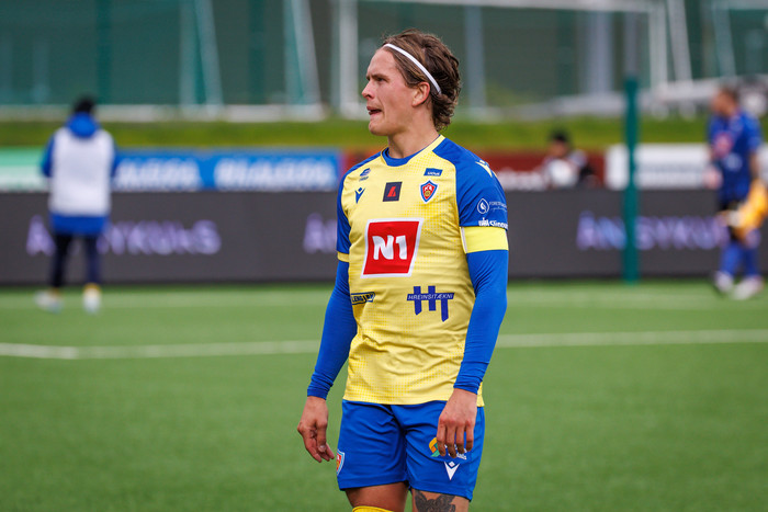 Markús Máni Pétursson lék í hjarta varnarinnar hjá KA í gær, hann verður tvítugur í næsta mánuði og kom við sögu í sex leikjum í Bestu deildinni í fyrra.