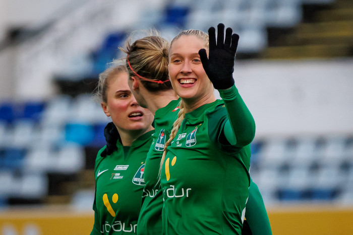 Nefndi hann sérstaklega, Karólínu Leu, sem skoraði um helgina. Guðrúnu Arnardóttur, sem er komin í gott lið og að standa sig vel. Þær Emilía Kiær Ásgeirsdóttir og Cecilía Rán Rúnarsdóttir sem hafa spilað vel og Sandra María hefur skorað mikið í vetur.