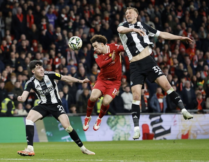 Dan Burn, leikmaður Newcastle, kom liðinu í forystu þegar Newcastle lagði Liverpool í úrslitum enska deildabikarsins í kvöld.