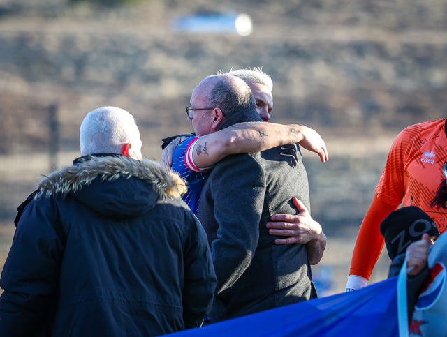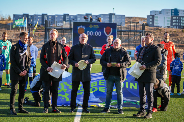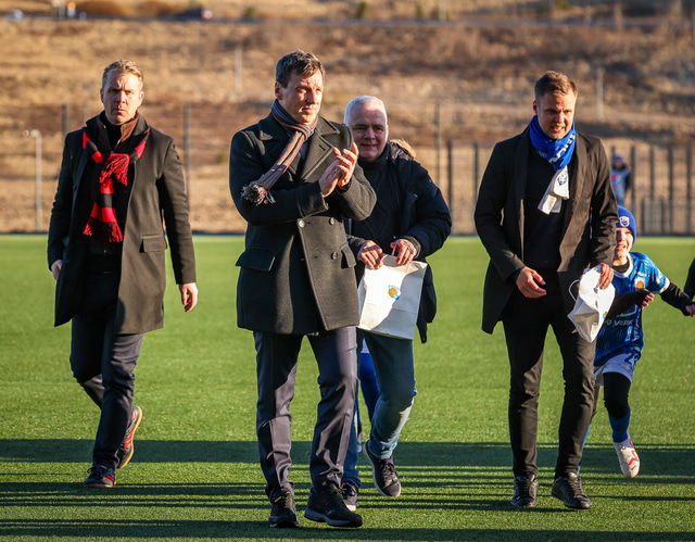 Þegar hópurinn mætti á eftir liðunum út á völlinn gengu þeir saman Guðmundur Torfason formaður knattspyrnudeildar Fram og nafni hans, Steinsson en báðir voru þeir miklir markaskorarar.