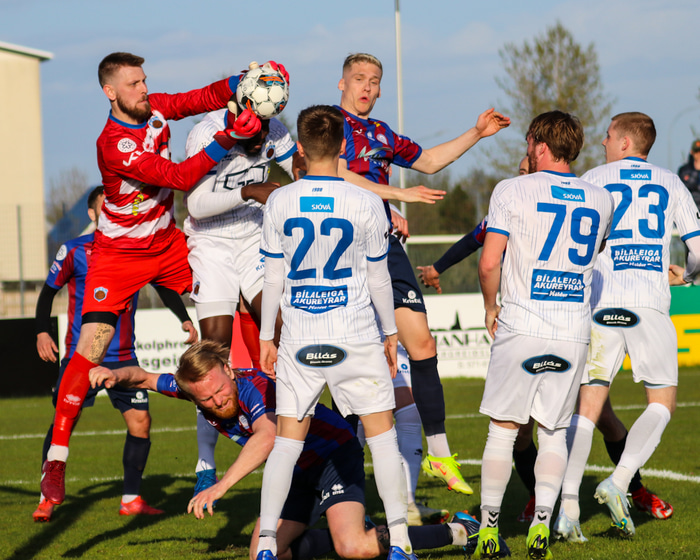 Róbert Hauksson kom sér í dauðafæri á 24. mínútu er hann komst einng gegn Ólafi Íshólm í markinu en skot hans fór beint á markvörðinn.
