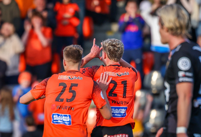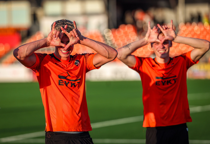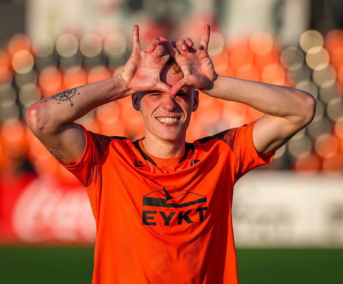 Fylkir vann 3 - 0 sigur á ÍA í Bestu-deild karla í gærkvöldi og þegar Aron Snær Guðbjörnsson fagnaði þriðja markinu mátti sjá hann beita einhverjum leynilegum merkjasendingum upp í stúku.