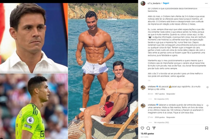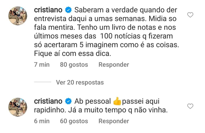 „Þið munuð heyra sannleikann þegar ég gef viðtal eftir nokkrar vikur. Fjölmiðlar gera ekkert nema ljúga. Síðustu mánuði hef ég skrifað niður hundrað fyrirsagnir af fréttum sem fjalla um mig og aðeins fimm þeirra eiga sér stoð í raunveruleikanum," skrifaði Ronaldo.
