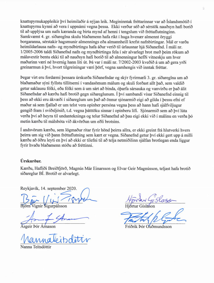 Siðanefnd Blaðamannafélags Íslands hefur kveðið upp þann úrskurð að þrír starfsmenn Fótbolti.net hafi brotið siðareglur félagsins með því að nafngreina og birta myndir af Andreu Rán Snæfeld Hauksdóttur, leikmanni Breiðabliks og Íslenska landsliðsins, í tengslum við umfjöllun um að hún hefði komið til Íslands smituð af Covid-19 veirunni en greinst neikvæð í skimun á landamærunum – sem aftur leiddi til frestunar Íslandsmóts, sóttkvíar knattspyrnuliða og loks breytinga á reglum um sóttvarnir.