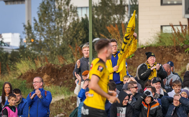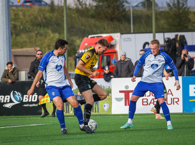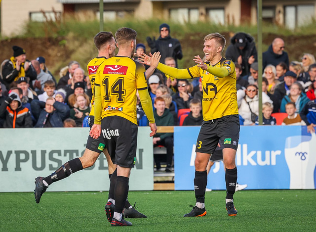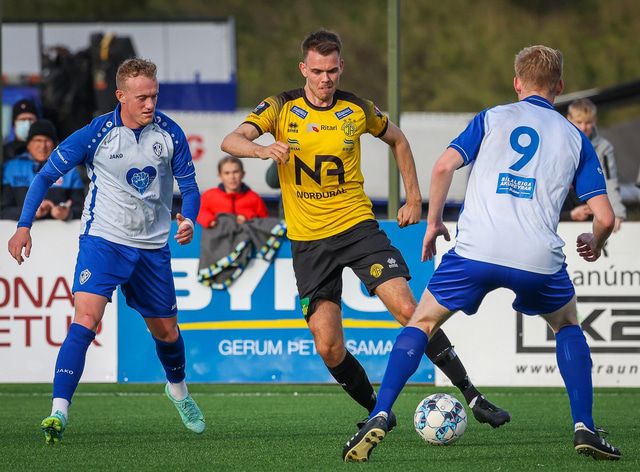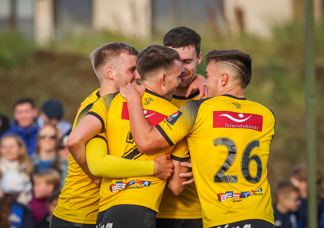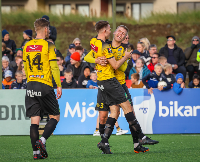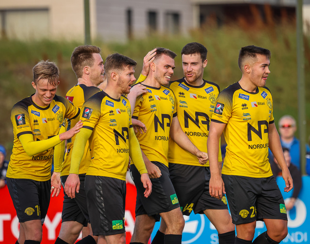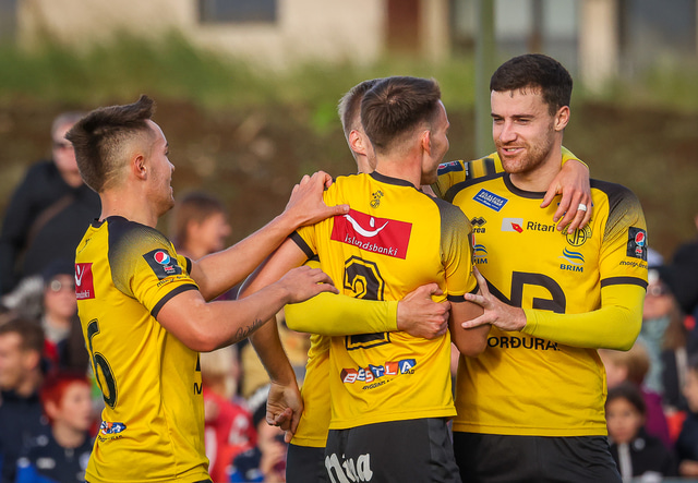 Skagamenn fagna marki Þórðar í gær. Að neðan eru nokkrar myndir en þar má sjá hvernig hann bar sig að við að skora markið.