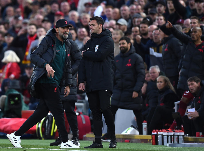 Klopp brást illa við og hljóp eftir hliðarlínunni og lét aðstoðardómarann heyra það.