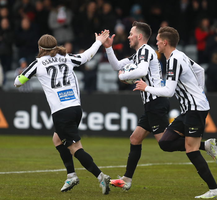 Í stöðunni 1-3 féll Stefán Árni Geirsson í teignum og Pétur Guðmundsson dæmdi víti. Pálmi Rafn Pálmason fór á punktinn og skoraði af öryggi.