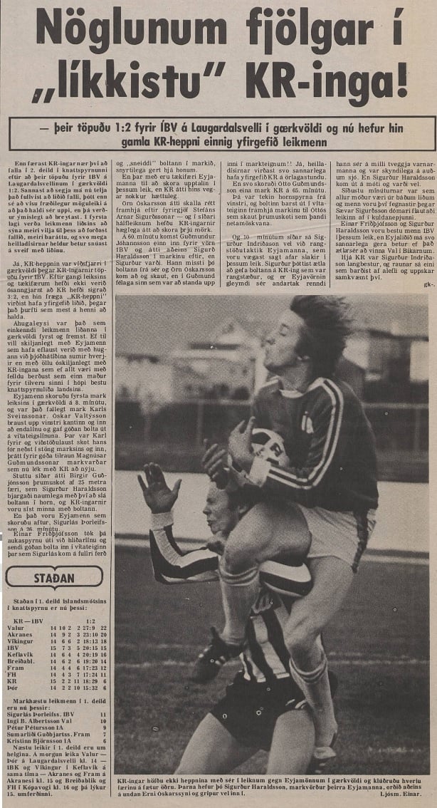 „Vesturbæjarliðið KR er nú á þröskuldi falls í 2. deild - hyldýpi 2. deildar blasir við eftir ósigur gegn ÍBV á Laugardalsleikvangi í gærkvöld, 1-2. KR hafði ekkert fram að færa - ekkert, ekki einu sinni baráttu," sagði í umfjöllun Dagblaðsins.