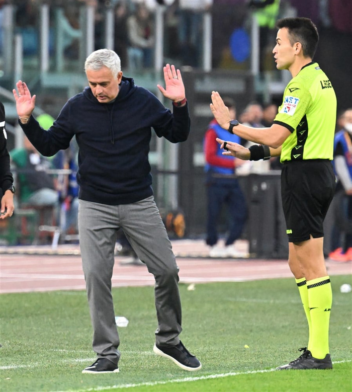Hann hafði gaman að þessu en hann rölti beint að bekknum og hélt höndum sínum á lofti. Þegar hann fékk sér sæti sást í Cristian Volpato, leikmann liðsins, hlæjandi að Mourinho sem reyndi að útskýra mál sitt og sína að þetta væri skónum sínum að kenna.