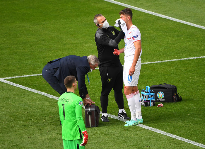 Schick lá eftir viðskipti sín við Lovren og var blóðugur.