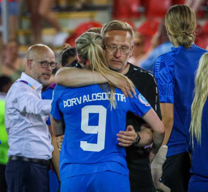 „Ég er eins og þú sagðir stoltur af mínu liði, ég get ekki sagt annað en að ég er stoltur. Við lögðum allt okkar í leikinn, reyndum að vinna leikinn og vildum vinna hann," sagði Þorsteinn Halldórsson, þjálfari kvennalandsiðsins, eftir jafntefli gegn Frakklandi í lokaleik Íslands á EM þetta árið. Jafnteflið þýðir að Ísland er úr leik, situr eftir með þrjú stig úr þremur leikjum.