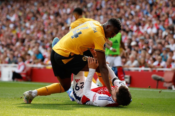 Hann var þó heppinn að sleppa við að fá spjald eftir samskipti sín við Yerson Mosquera, leikmann Wolves og kólumbíska landsliðsins.