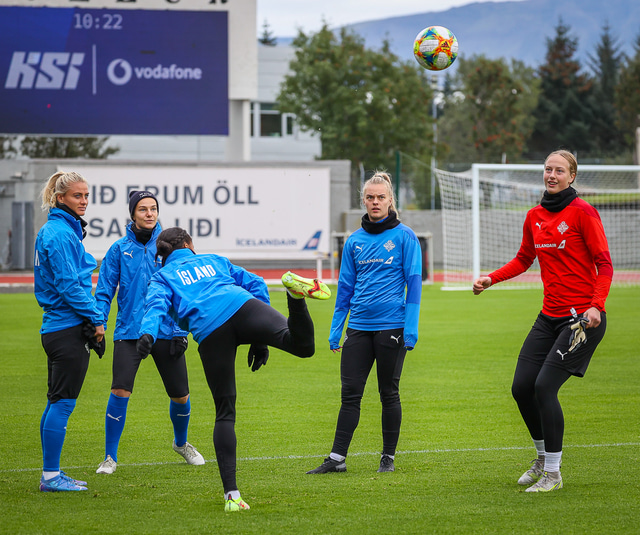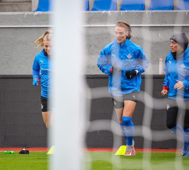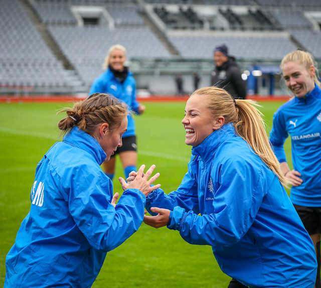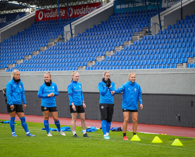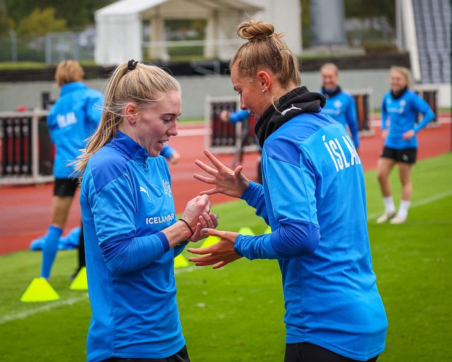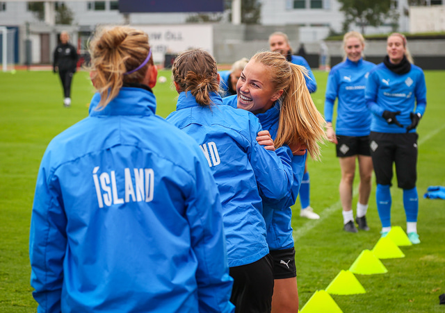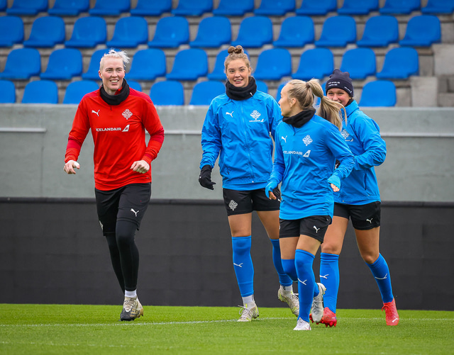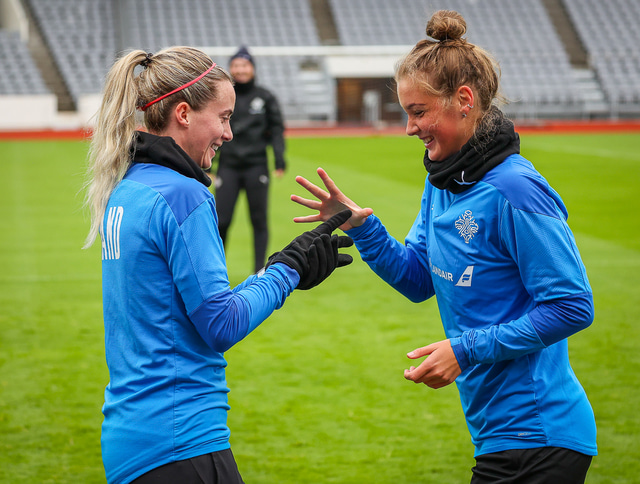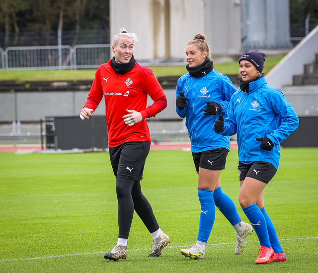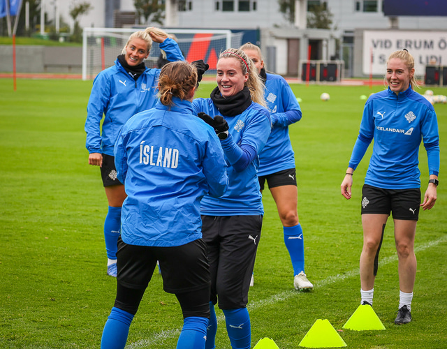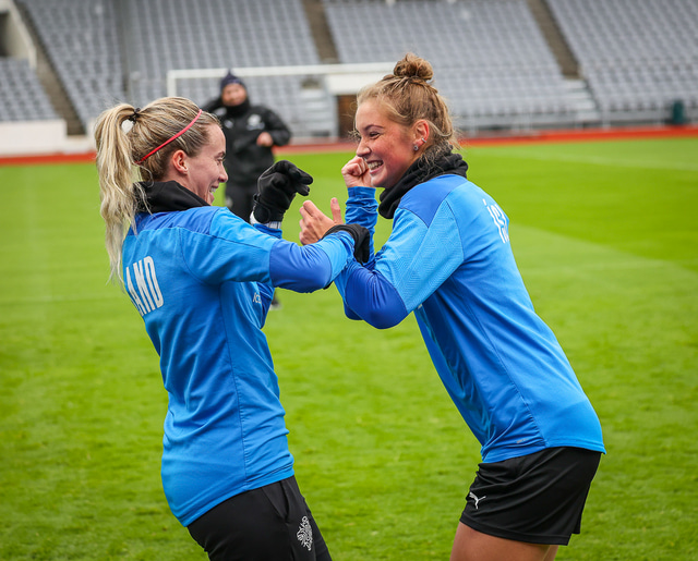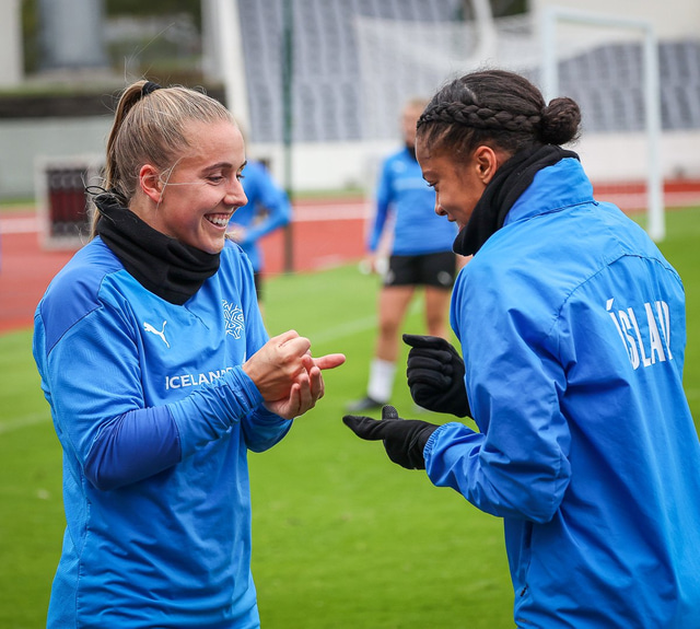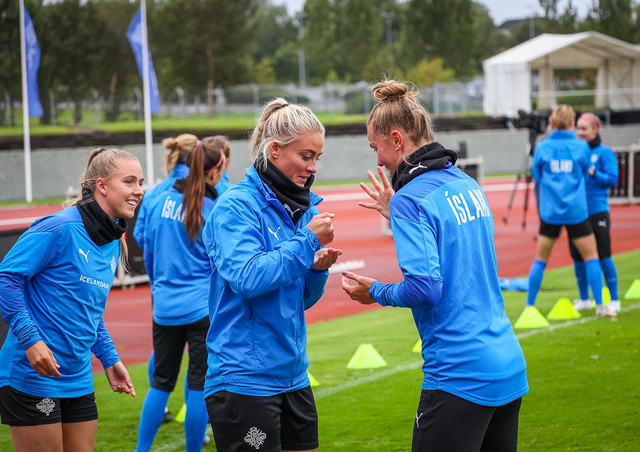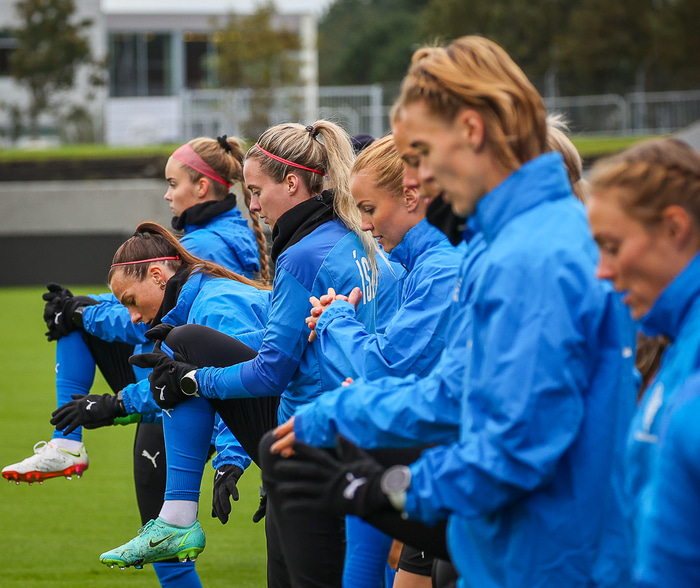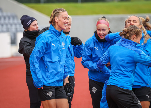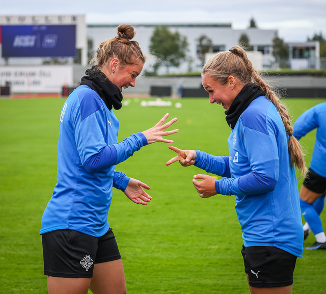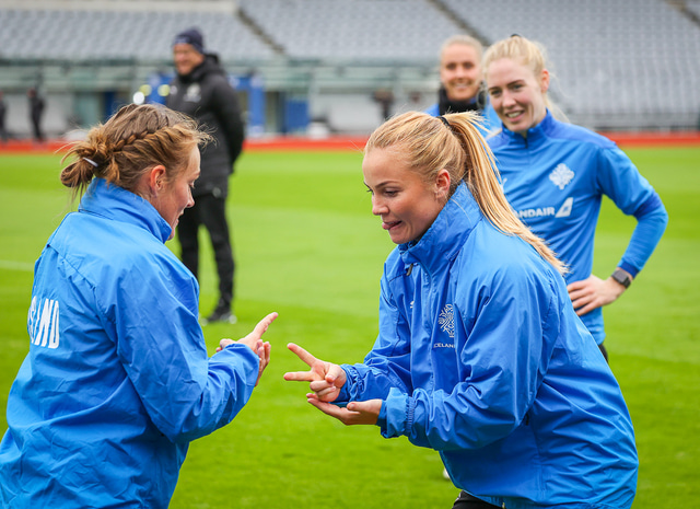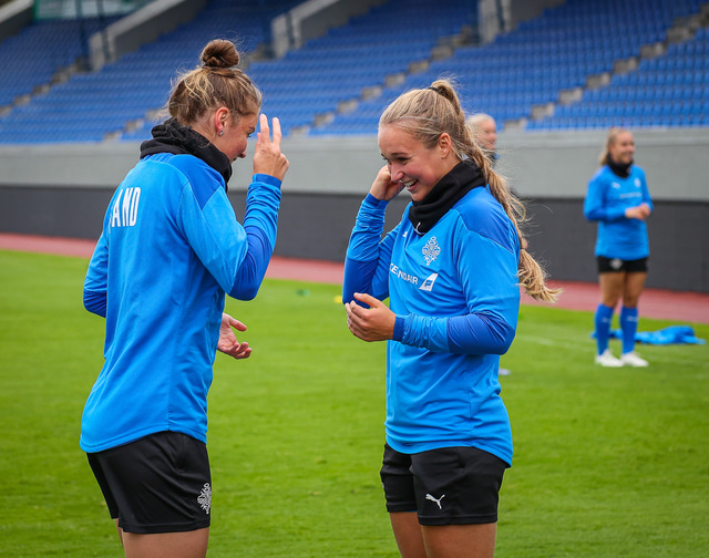 Kvennalandsliðið undirbýr sig nú af kappi fyrir stórleikinn við Hollandi í undankeppni HM 2023 sem fer fram á Laugardalsvelli á þriðjudagskvöldið. Stelpurnar æfðu í morgun í Laugardalnum og hér að neðan má sjá myndir af æfingunni þar sem mikið fjör var í steinn, skæri, blað.