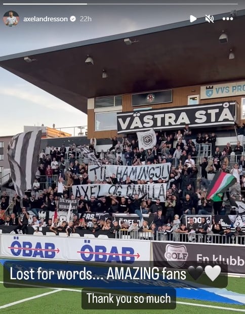 Á borða í stúkunni stóð á íslensku: „Til hamingju Axel og Camilla"