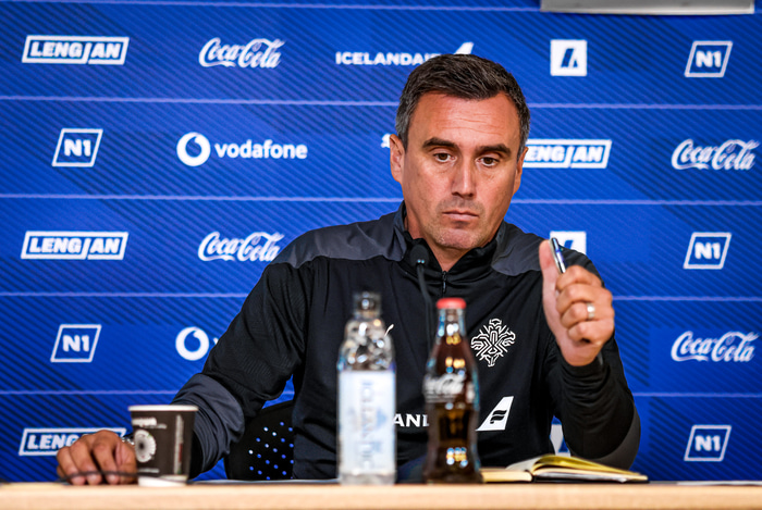 „Þetta eru bara útfærslur sem fara eftir því hvernig við viljum verjast. Heima á móti Ísrael síðasta sumar þá spiluðum við nánast 4-4-2 varnarlega þegar Hákon var að setja pressu á hafsent hjá andstæðingnum. 4-3-3 eða 4-4-2, þetta er tala á blaði. Það sem er mikilvægara er hvernig við viljum verjast og hvernig við viljum sækja," sagði Arnar.