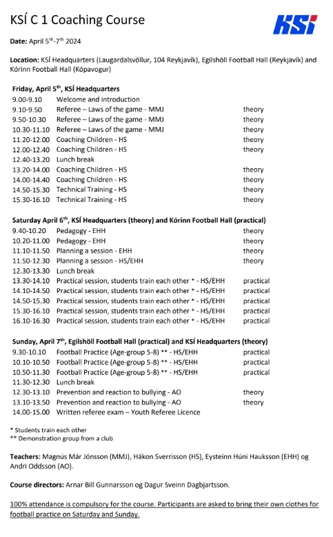 If registration goes well for this course, KSÍ C 2 will be held in English on the weekend of April 19-21, 2024. Coaches that finish both KSÍ C 1 and KSÍ C 2 will get a KSÍ C / UEFA C coaching diploma.