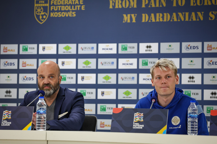 Nýr fyrirliði íslenska landsliðsins, Orri Steinn Óskarsson, sat fyrir svörum á fréttamannafundi í Pristina í Kósovó í dag.