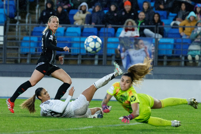 Real Madrid er með 2-0 forystu gegn Arsenal í 8-liða úrslitum Meistaradeildar kvenna eftir sigur í Madrid í gær.