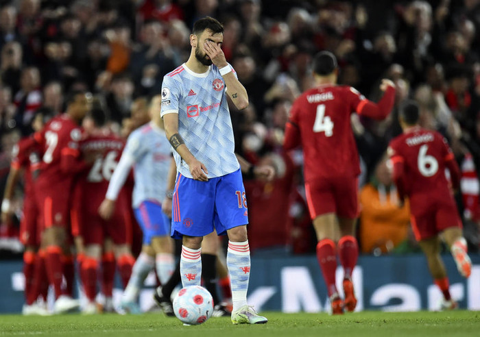 Liverpool er 2-0 yfir gegn Manchester United í ensku úrvalsdeildinni en liðin eigast við á Anfield. Luis Díaz og Mohamed Salah skoruðu mörkin.