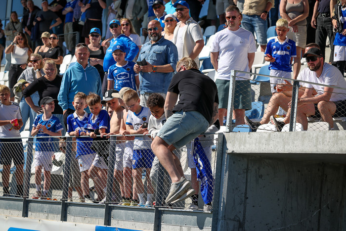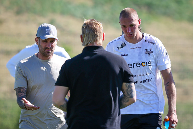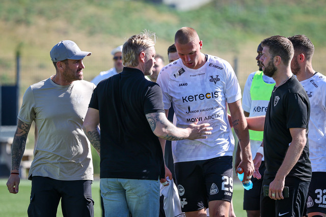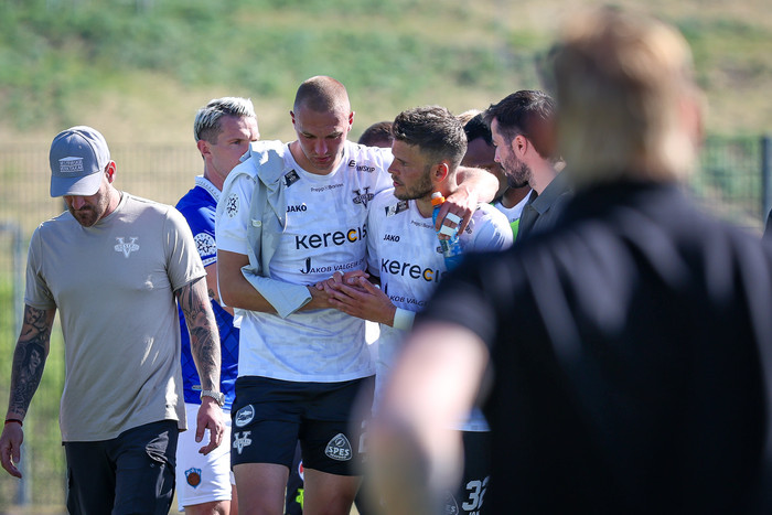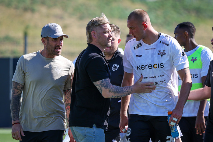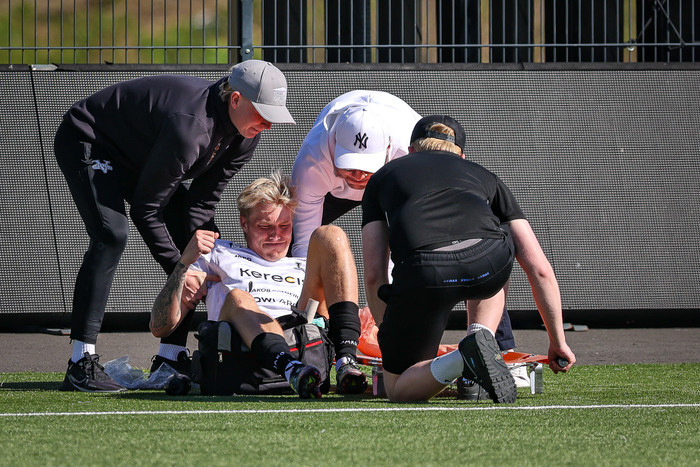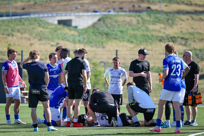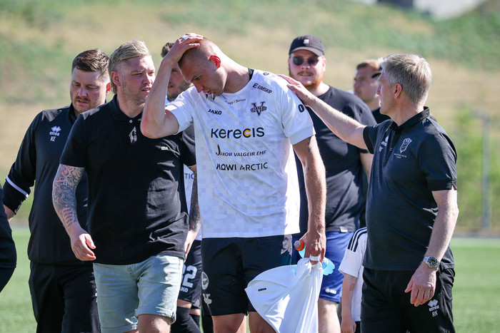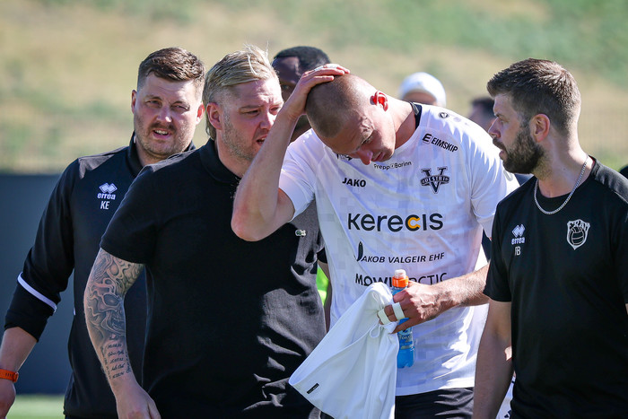 Arnór Borg Guðjohnsen hafði legið meiddur bak við endalínuna í dágóðan tíma og notið aðhlynningar þegar flautað var af. Við lokaflautið fékk framherjinn Kristoffer Grauberg höfuðhögg.