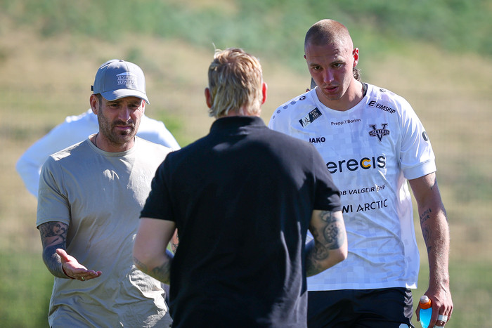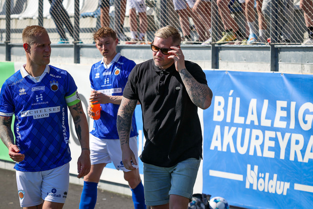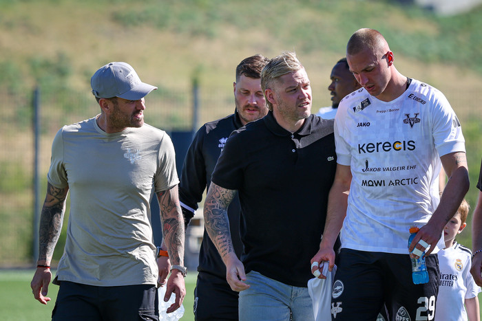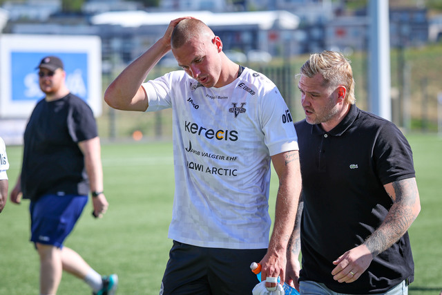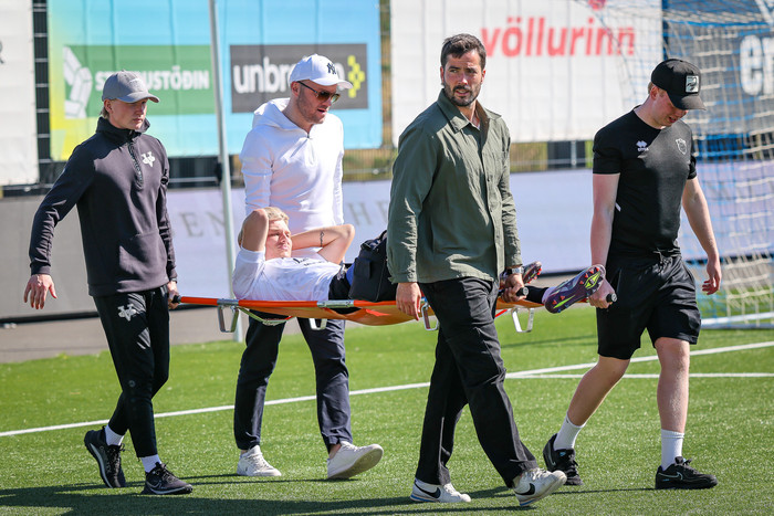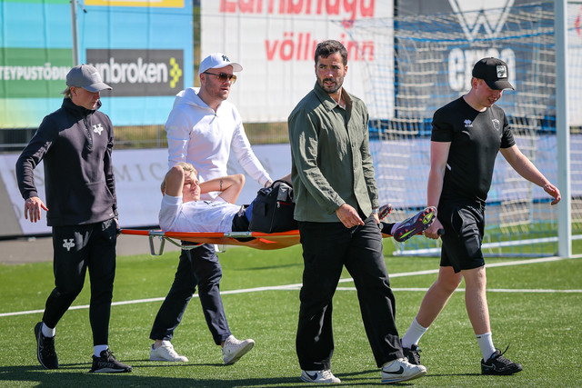 Eftir að allt var afstaðið þar var hægt að beina athyglinni aftur að Arnóri Borg sem þurfti að fara á börum. Þá vantaði fleiri á börurnar og Sigurður Hrannar Björnsson formaður meistaraflokksráðs karla hjá Fram stökk til og aðstoðaði við að bera Arnór Borg af velli.