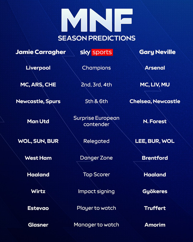 Sparkspekingarnir Gary Neville og Jamie Carragher opinberuðu spádóma sína fyrir keppnistímabilið í Monday Night Football á Sky Sports í gær.