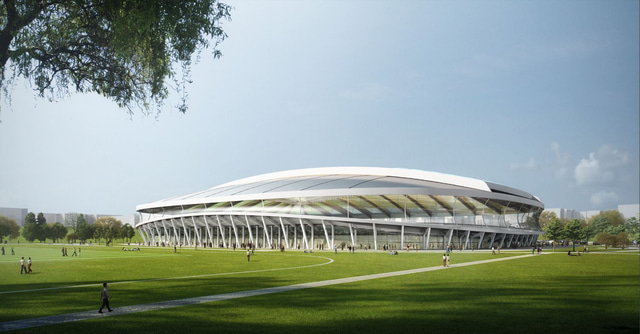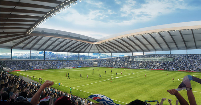 Sama mynd og að undan nema hér er búið að setja þakið yfir völlinn. Þakið væri færanlegt og hægt að nota þegar þarf.