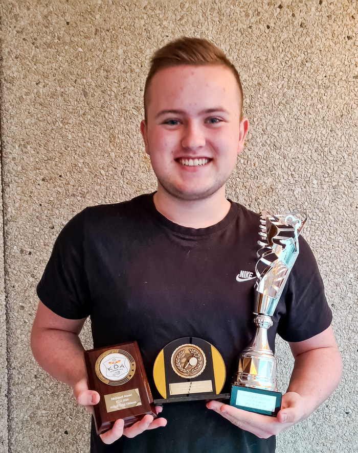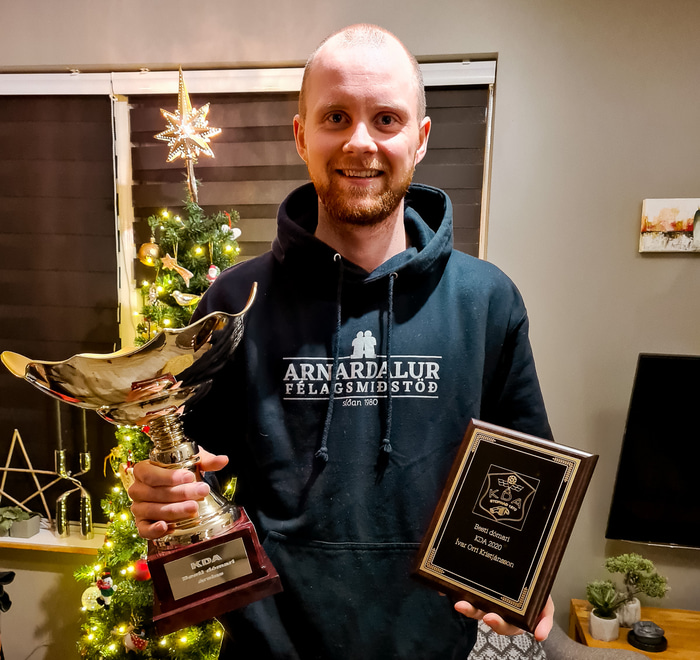 Arnþór Helgi með verðlaunagripina fyrir að vera valinn Efnilegasti dómari KDA 2020 og besti dómarinn að mati þjálfara ÍA.