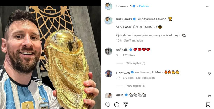 Í klefanum eftir leikinn, haldandi á heimsmeistarabikarnum, hringdi Messi í Luis Suarez gegnum FaceTime. Úrúgvæski sóknarmaðurinn setti skjáskot á Instagram og skrifaði við „Til hamingju feiti".