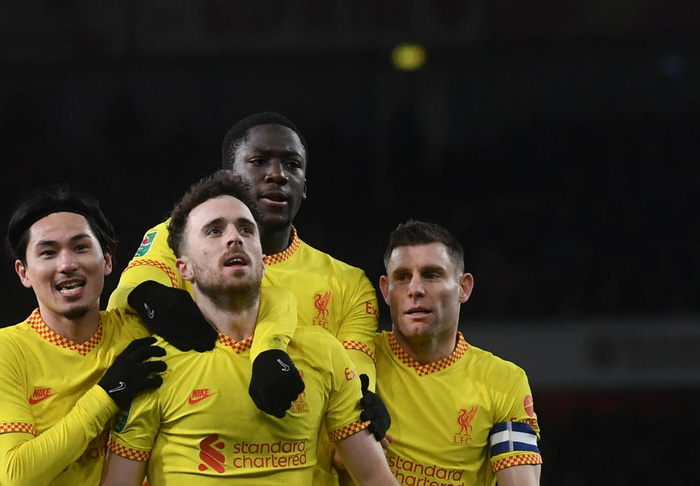 Diogo Jota skoraði bæði mörk Liverpool þegar liðið lagði Arsenal að velli í undanúrslitum enska deildabikarsins í kvöld. Liverpool fer á Wembley.