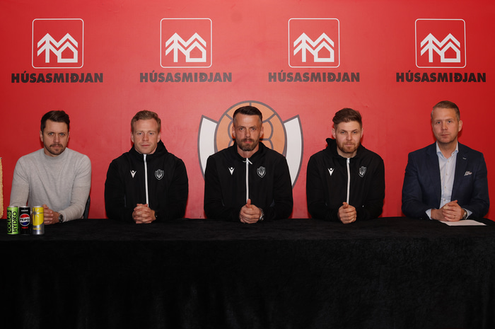 Sölvi ásamt aðstoðarmönnum sínum og Kára Árnasyni yfirmanni fótboltamála og formanninum Heimi Gunnlaugssyni.