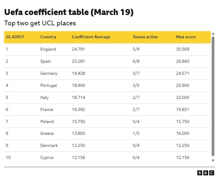 UEFA gefur þeim tveimur þjóðum sem hafa staðið sig best á tímabilinu í Evrópukeppnum aukasæti. Þetta fyrirkomulag tók gildi á síðasta tímabili þegar Meistaradeildin var stækkuð úr 32 í 36 lið.