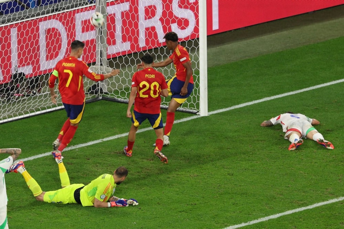 Staðan var markalaus í leikhlé og gerðu Ítalir tvöfalda skiptingu í hálfleik, en það lagaði ekki stöðuna. Spánverjar voru áfram sterkari aðilinn og tóku loks forystuna á 55. mínútu, þegar Riccardo Calafiori varð fyrir því óláni að skora sjálfsmark.