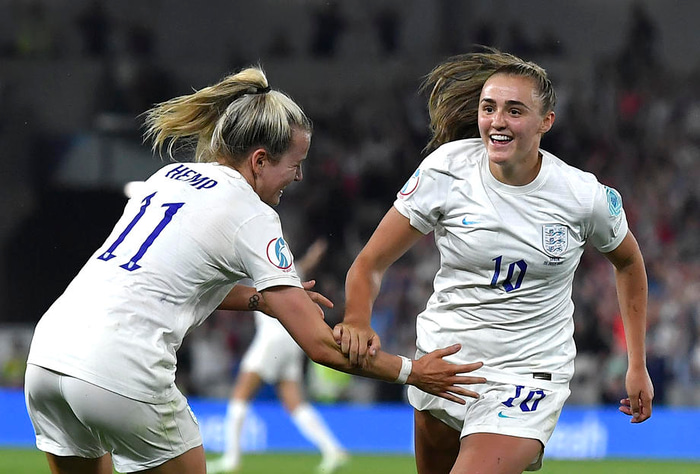 Georgia Stanway kom Englandi yfir eftir sex mínútna leik í framlengingunni með stórkostlegu skoti fyrir utan teig.