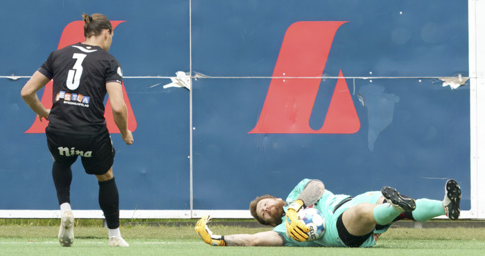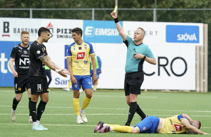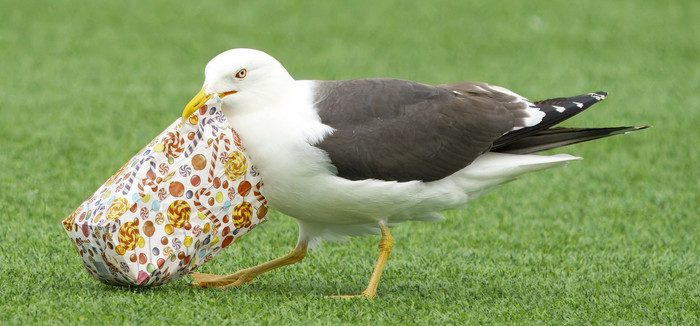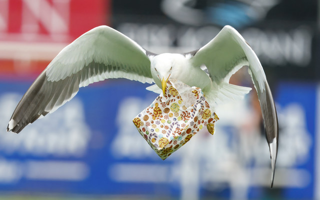 Það var skemmtilegt atvik í fyrri hálfleik þegar fugl flaug inn á völlinn með nammipoka eins og sést á meðfylgjandi myndum.