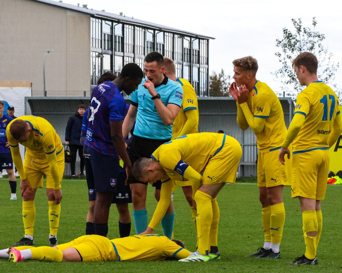 „Þessi leikur hefði að öllum líkindum farið jafntefli eða sigur fyrir okkur ef það hefði verið dæmt víti og rautt spjald þegar hann bjargar með hendi, varnarmaðurinn hjá þeim á 60. mínútu. Ég hugsa að þetta hafi verið 'reflex', en veit ekki hvort hann gerði þetta viljandi. Hann lyftir bara hendinni upp fyrir höfuðið á sér og tekur hann með hendinni. Ég skil ekki hvernig aðstoðardómari tvö og dómarinn sjá þetta ekki. Aðstoðardómari tvö er í beinni línu við þetta og maður er ný búinn að horfa á þennan bikarúrslitaleik og þetta er bara ólýsanlega pirrandi þegar það eru gerð svona risastór mistök. Þetta hefur gríðarleg áhrif á þetta einvígi að sleppa því að dæma víti og rautt spjald.“