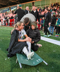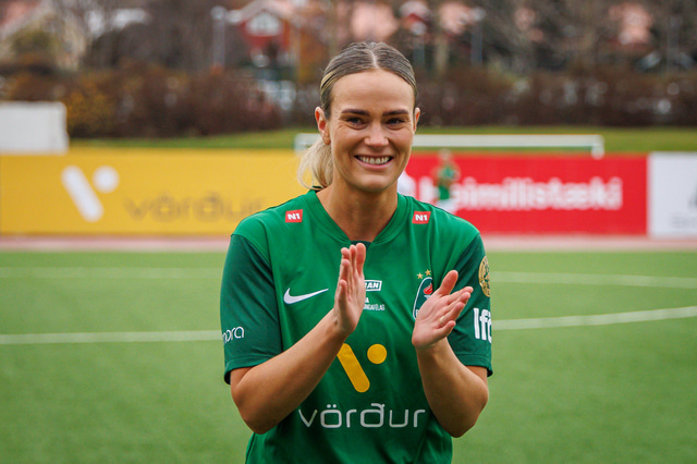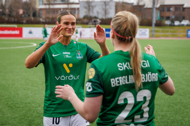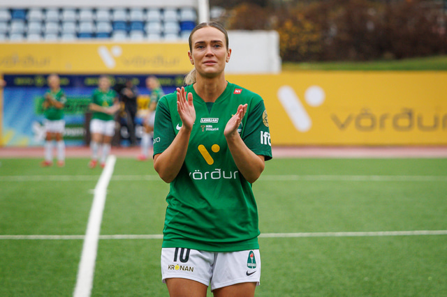 Eftir leik lyfti hún svo Íslandsmeistaraskildinum í annað sinn en alls hefur hún orðið Íslandsmeistari fjórum sinnum.