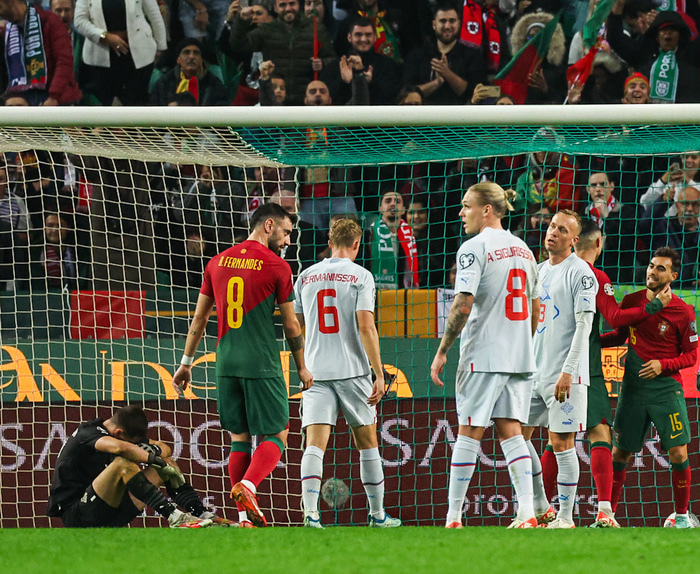 Íslenski markvörðurinn gerði mistök í öðru markinu er hann ætlaði að handsama skot Joao Felix, en missti boltann til Cristiano Ronaldo sem náði að pota honum úr höndum Hákonar og til Horta sem skoraði.
