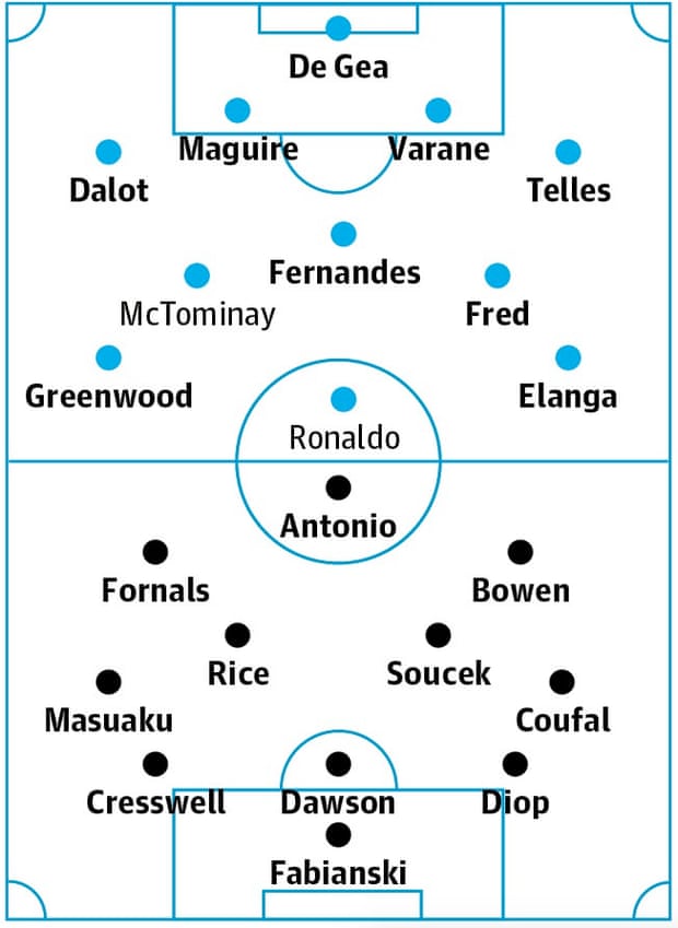 Jadon Sancho er líklega aftur frá vegna persónulegra ástæðna og þá eru Eric Bailly, Paul Pogba, Luke Shaw og Aaron Wan-Bissaka fjarri góðu gamni. Scott McTominay ætti að gera spilað.