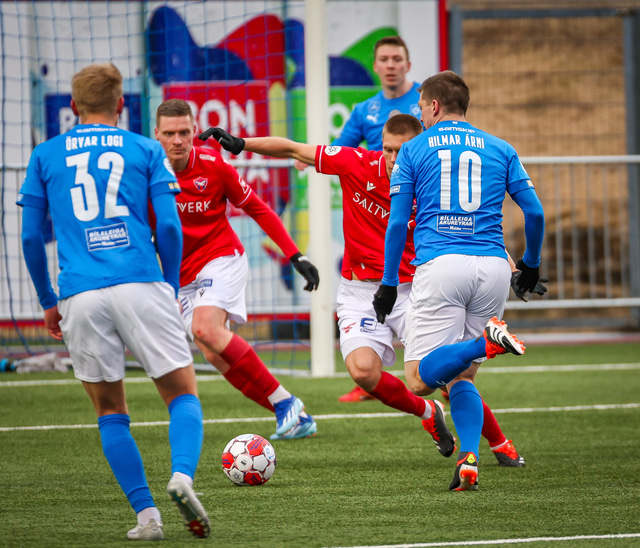 „Það er fátt betra ef þú ætlar að bjóða upp á töfra í teignum að fá þrjár 'tíur' til að reyna að verjast þér. Gylfi og Kiddi fóru saman í að reyna að stoppa hann, hann snýr í gegnum þá tvo og þá ætlar þriðja tían, Aron Jó, að koma með tæklingu en var ljósárum frá því að ná til boltans. Þetta var hægt en fallegt hjá Hilmari, snúningurinn trylltur," segir Tómas Þór Þórðarson.