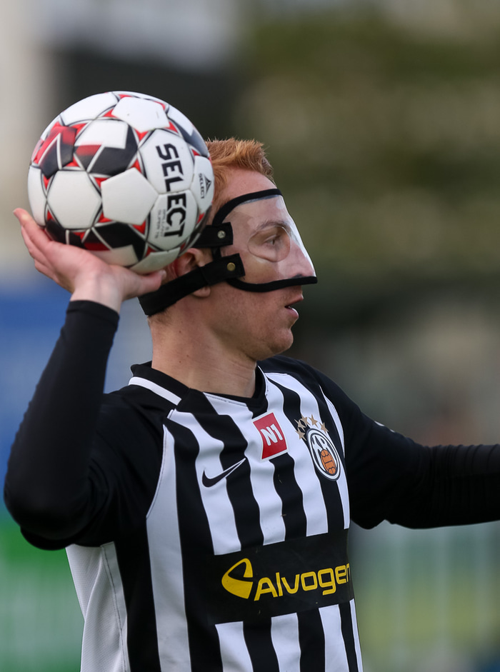 „Ég nefbrotnaði í bikarleiknum gegn Dalvík fyrir þremur vikum. Þá var bara að láta smíða grímu á sig hjá Össur til að geta æft og spilað," sagði Aron Bjarki við Fótbolta.net.