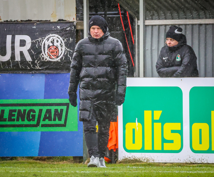„Nei nei, ég held það sé alveg ljóst að vindurinn spilaði stórt hlutverk í þessum leik. Þeir voru með vind í fyrri hálfleik og við vorum á móti vind. Þeir voru náttúrulega málsins samkvæmt, þá var auðveldara fyrir þá að koma boltanum upp heldur en okkur í fyrri hálfleik, án þess þó að mér fannst þeir ekki skapa sér neitt að ráði. Við gerðum það reyndar varla neitt heldur en leikurinn var bara í jafnvægi. Svo auðvitað bara byrjum við af krafti í seinni hálfleik. Það voru engar sérstakar áherslu breytingar að því leitinu til, vítið kemur út úr pressu sem var líka til staðar í fyrri hálfleik. Það var bara erfiðara fyrir okkur að framkvæma hana og kannski auðveldara fyrir KA að spila sig út úr henni í fyrri hálfleik en málið var bara það að það var kveikt á okkur. Við vorum grimmir, við vorum aggressívir og vorum sterkir án bolta, bæði á þeirra helmingi og okkar. Þegar svo er þá erum við góðir líka þegar við erum með boltan og mér fannst við geta skorað fleiri mörk í seinni hálfleiknum."