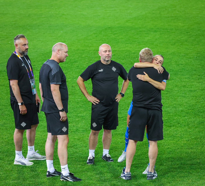 Hafliði Breiðfjörð, framkvæmdarstjóri Fótbolta.net, náði skemmtilegu augnabliki á filmu þegar Hallbera faðmaði Þorstein Halldórsson landsliðsþjálfara eftir leikinn. Þjálfarateymið horfði á en Hafliði veltir fyrir sér hvort þetta hafi verið augnablikið sem hún tjáði teyminu að hún væri hætt.