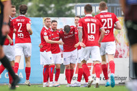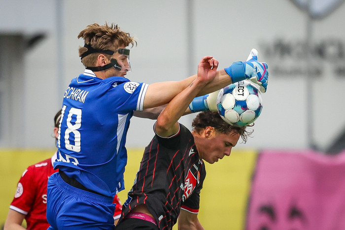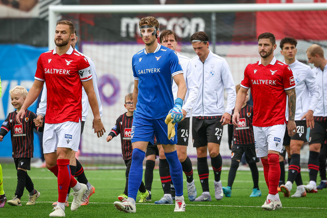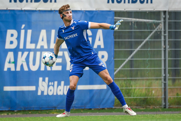Frederik Schram, markmaður Vals, var með andlitsgrímu þegar hann stóð vaktina í marki Vals gegn Víkingi í gær. Frederik fékk högg á andltiið og blóðnasir þegar Valur vann eistneska liðið Flora Tallinn á fimmtudag og gat ekki klárað þann leik.