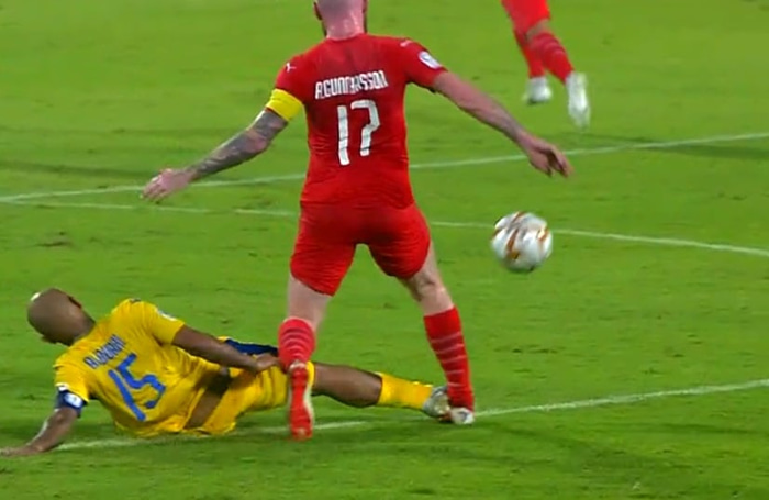 Hér að neðan má sjá tæklinguna ljótu sem Aron varð fyrir.