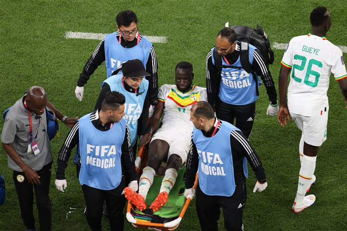Ólíklegt er að Kouyate hafi verið borinn af velli vegna höggsins frá De Jong. Það lítur út fyrir að hann hafi rifið vöðva aftan í læri í stökkinu og gæti misst af restinni af HM.