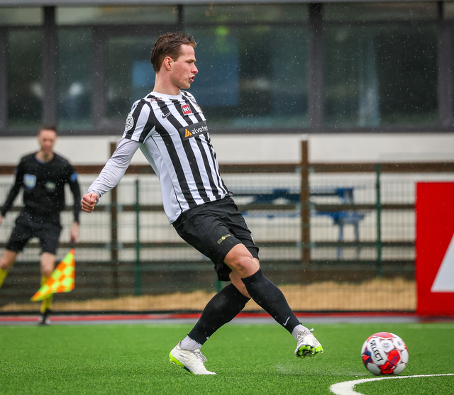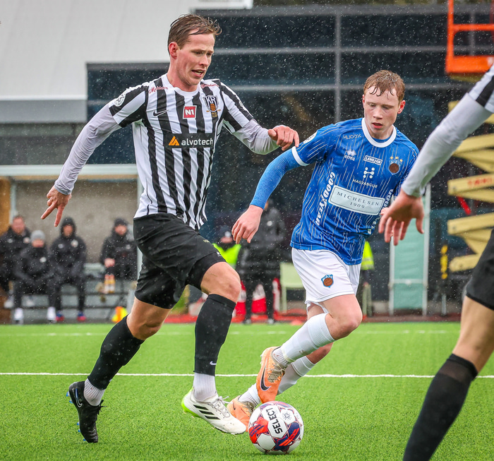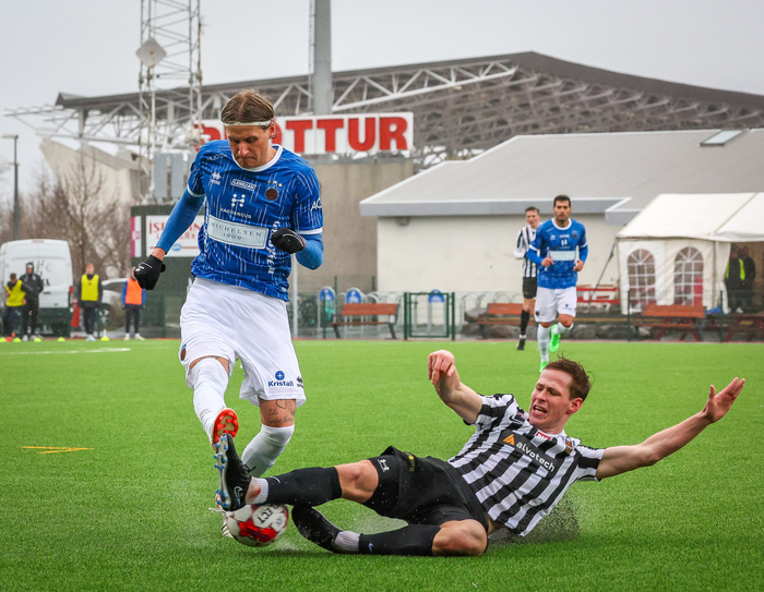 Alex Þór í einni hressilegri tæklingu í leiknum gegn Fram á laugardaginn. Hér er hann í svörtum skóm en neðst í fréttinni má sjá myndir af öllum samsetningum hans.