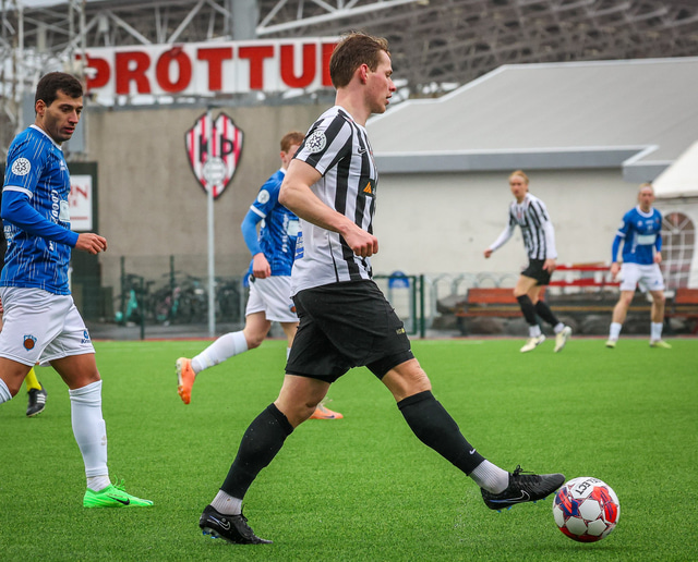 Hann er að máta sig við röndótta KR búninginn og eitt af því sem þarf að komast að fyrir framtíðina er hvaða skósamsetning passar beint við búninginn.