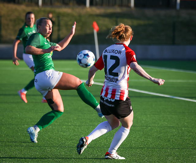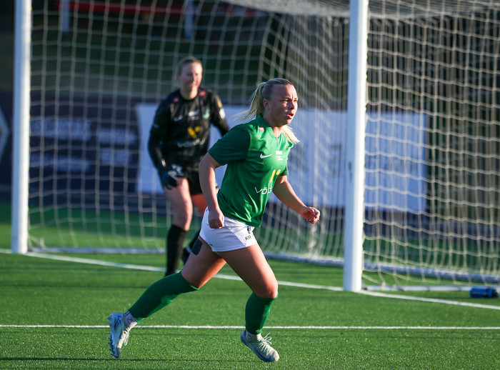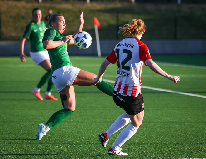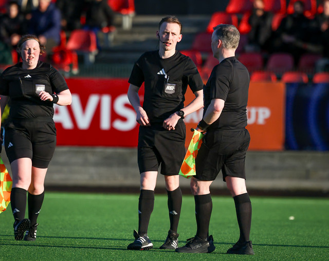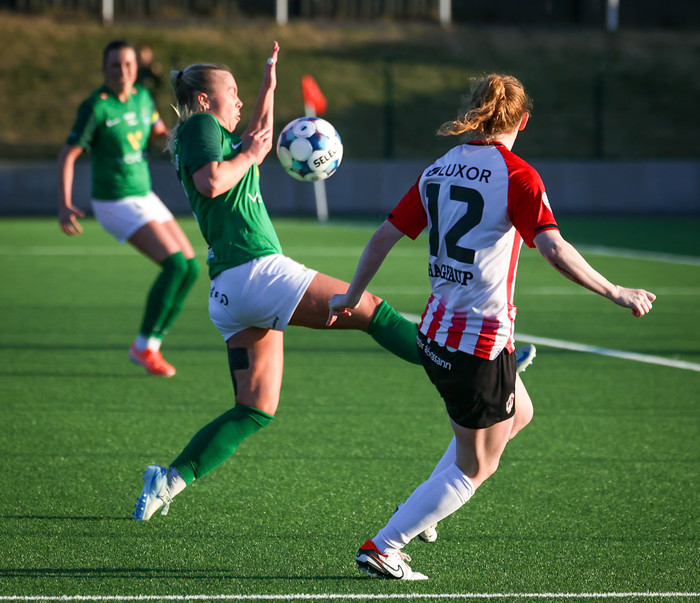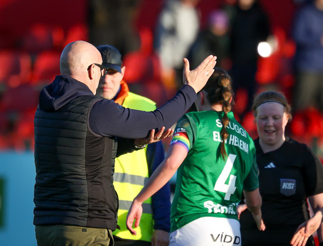 Kristín Dís Árnadóttiir fékk boltann í höndina eftir fyrirgjöf frá Caroline Murray en Hreinn Magnússon, dómari leiksinis, dæmdi ekkert og flautaði leikinn af stuttu síðar.