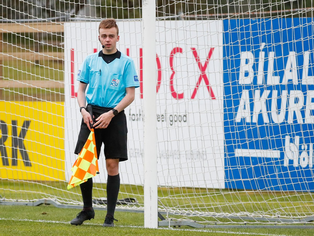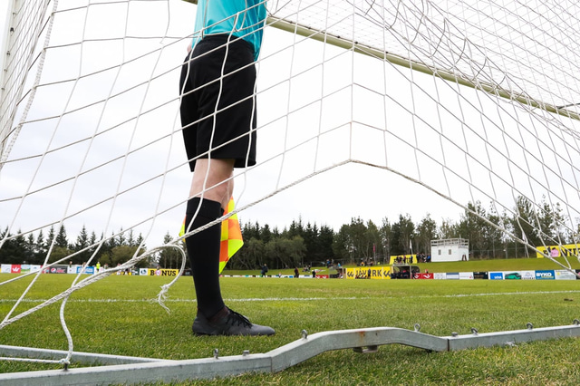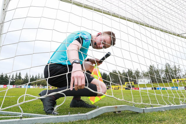 Þegar Elvar Smári Arnarsson aðstoðardómari skoðaði markið eftir leikhlé tók hann eftir að risastórt gat hafði myndast á markinu í hálfleik.